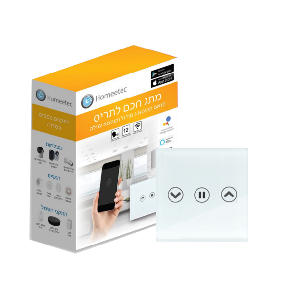 מפסק חכם לתריס חשמלי לשליטה בתריסי החשמל בביתך, עשוי זכוכית קריסטלית בעיצוב מינימליסטי וגימור יוקרתי. לצד ההפעלה החשמלית על ידי מגע טאצ', ניתן להפעיל ולשלוט מאפליקציה / שלט / מסך שליטה מרכזי. המפסק תוכנן ועוצב באופן כזה שנגיעה קלה על אחד הלחצנים בפאנל תבצע פעולה ממושכת של עלייה וירידה באופן אוטומטי, ללא צורך בלחיצת אצבע ממושכת. מתג תריס חכם ניתן לרכישה והרכבה ללא צורך בתשתית נוספת ומאפשר שליטה באמצעות שלט או באמצעות הסמארטפון בחיבור לראוטר הביתי. כמו כן, המתג ניתן להוספה כאחד האביזרים בתוך מגוון מערכות הבית החכם.