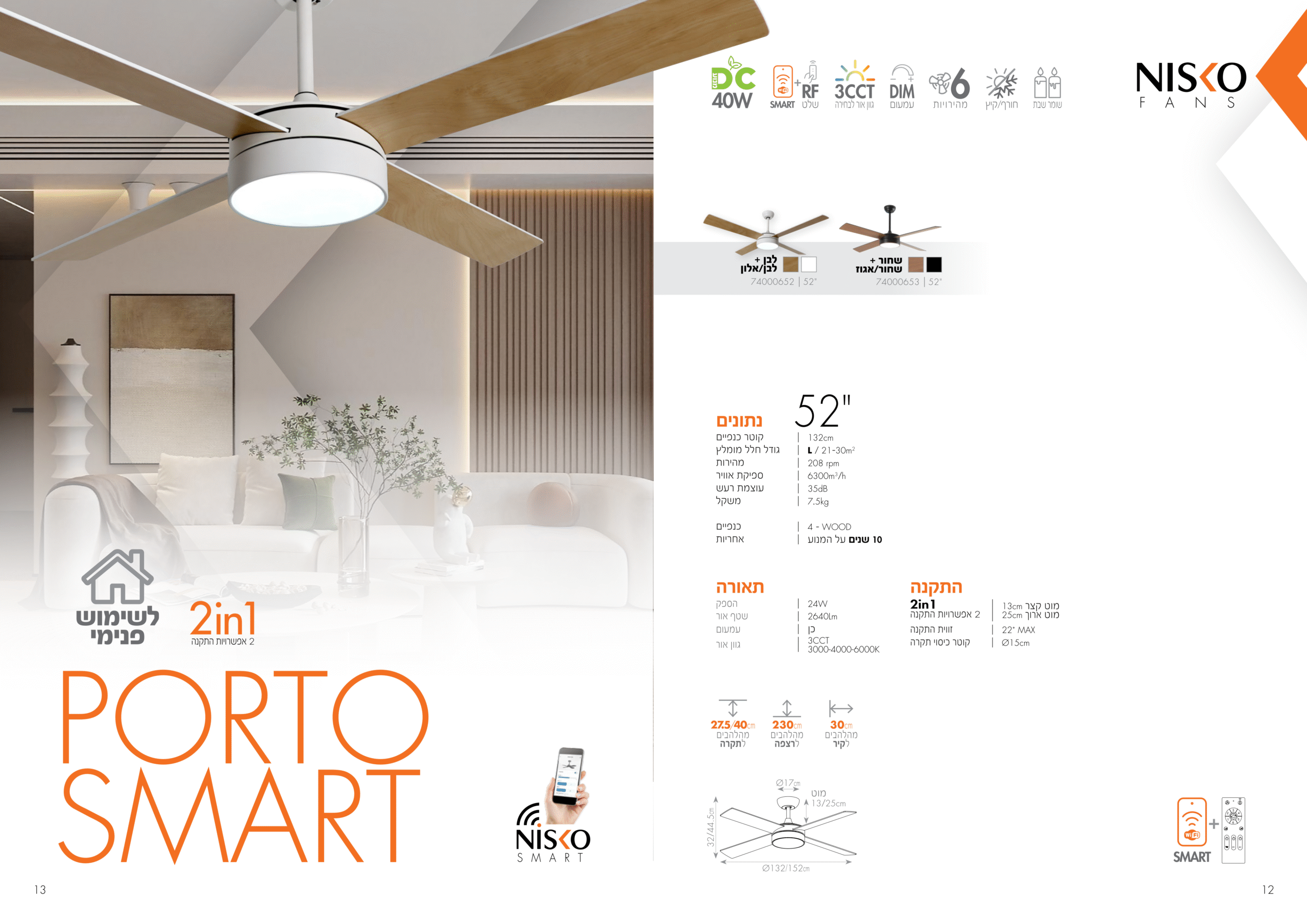– תיאור: מאוורר תקרה חכם PORTO 52" SMART